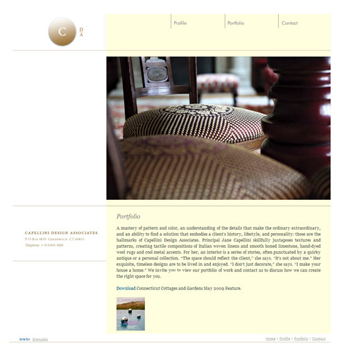 Jane Capellini of Capellini Design Associates in Greenwich, CT, asked me to design a new logo and corporate identity for her new interior design company. The identity had to reflect the spare and luxurious style of the interiors she designs for her clients.The new identity was launched with a printed leave-behind portfolio piece that showcased the firm's interiors and with a website. The new presentation materials, and especially the website, have been extremely well received by the firm's clients. Capellini Design has experienced increased website traffic and new billings and has attracted several press inquiries.