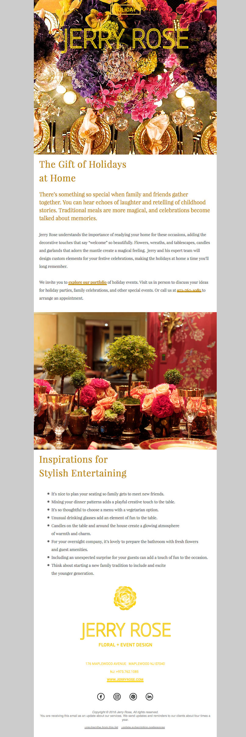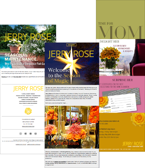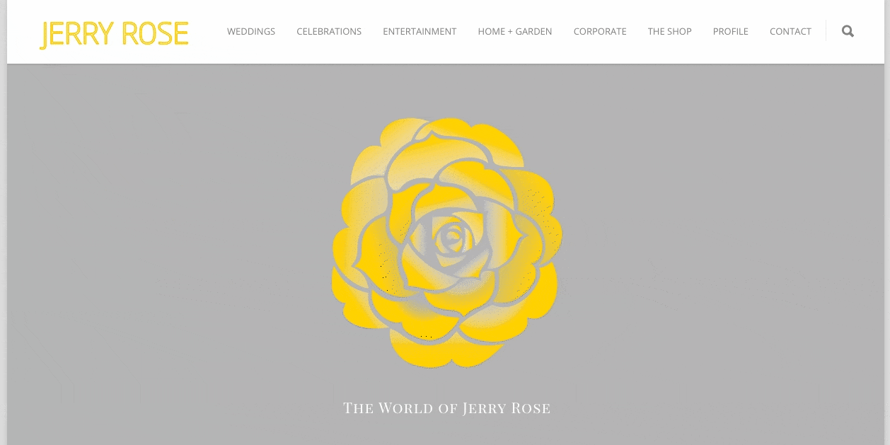 Branding of luxury event design company, Jerry Rose. The new logo, new website, and new visual identity serve as the cornerstones of the company's image, as it establishes itself as a premier event design and production company. The new logo was supplemented with new photography of the company's events that enhance the visual direction of the company.